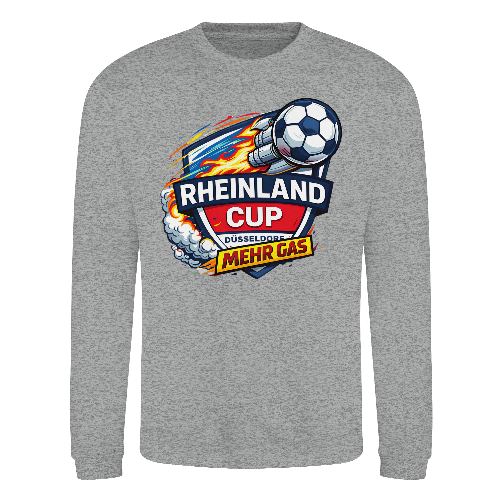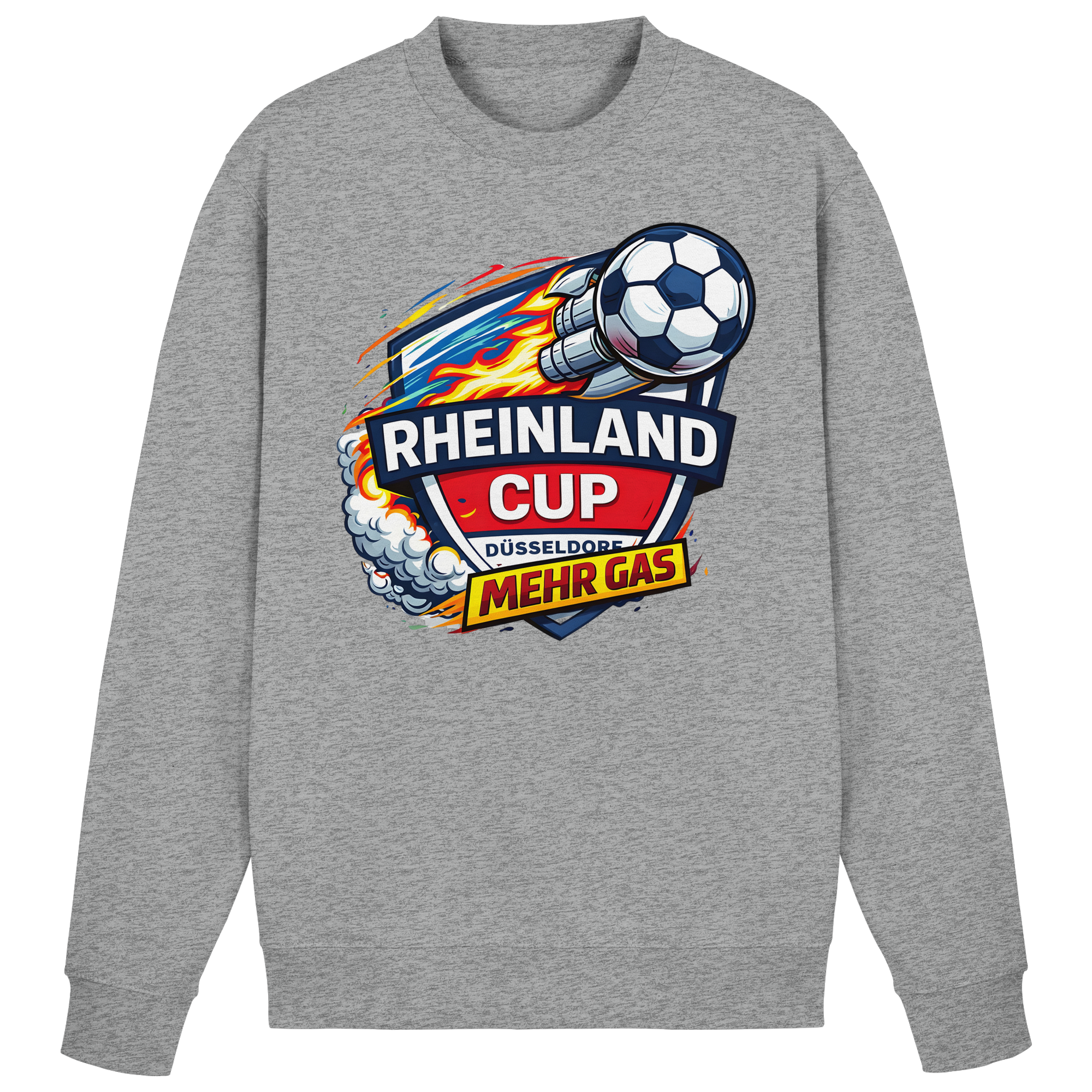 Experience the thrill of the Rheinland Cup with our exclusive Düsseldorf Mehr Gas Sweatshirt. This limited edition piece is not just a garment; it's a statement of enthusiasm and energy.