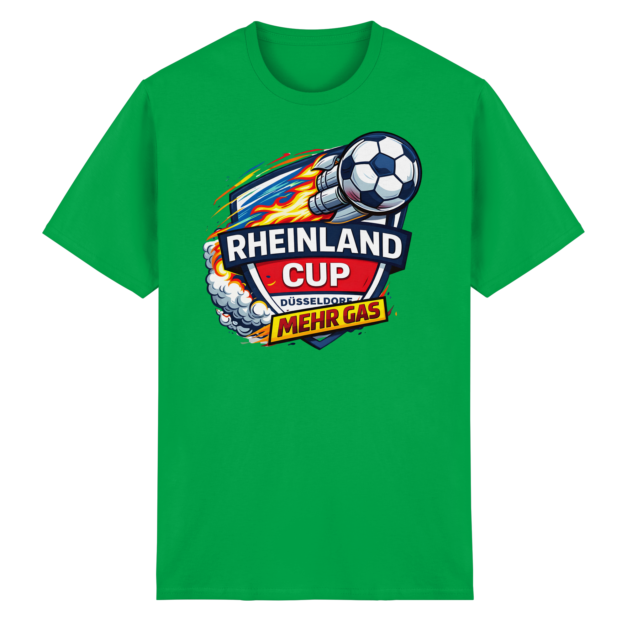 The bold, uppercase font of 'Rheinland Cup Düsseldorf' and 'MEHR GAS' commands attention, making a statement wherever you go.
